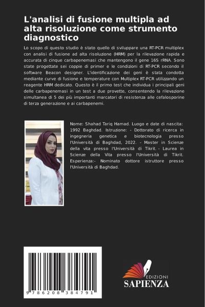 Lo scopo di questo studio è stato quello di sviluppare una RT-PCR multiplex con analisi di fusione ad alta risoluzione (HRM) per la rilevazione rapida e accurata di cinque carbapenemasi che mantengono il gene 16S rRNA. Sono state progettate sei coppie di primer e le condizioni di RT-PCR secondo il software Beacon designer. L'identificazione dei geni è stata condotta mediante curve di fusione e temperature con Multiplex RT-PCR utilizzando un reagente HRM dedicato. Questo è il primo test che individua i principali geni delle carbapenemasi in un test a due provette, consentendo la rilevazione simultanea di 5 dei più importanti marcatori di resistenza alle cefalosporine di terza generazione e ai carbapenemi.