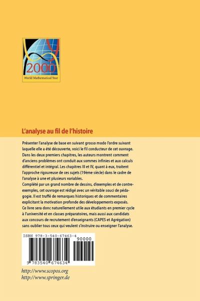 Cet ouvrage traite des théorèmes fondamentaux de l'analyse (convergence, continuité, calcul différentiel et intégral à une et plusieurs variables) avec grand soin pédagogique, une centaine de dessins, d'exemples et de contre-exemples. Pour une meilleure compréhension du sujet, il commence avec des calculs anciens de problèmes géometriques et mécaniques, qui ont conduit aux séries infinies, dérivées, intégrales, équations différentielles. Ainsi ce volume nous fait découvrir "l'analyse au fil de l'histoire". De nombreuses motivations et remarques historiques enrichissent le texte.