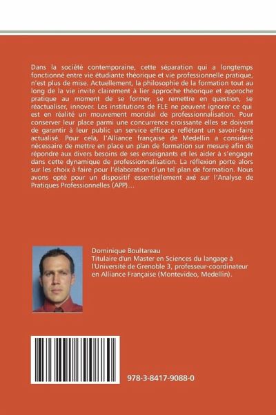 Dans la société contemporaine, cette séparation qui a longtemps fonctionné entre vie étudiante théorique et vie professionnelle pratique, n'est plus de mise. Actuellement, la philosophie de la formation tout au long de la vie invite clairement à lier approche théorique et approche pratique au moment de se former, se remettre en question, se réactualiser, innover. Les institutions de FLE ne peuvent ignorer ce qui est en réalité un mouvement mondial de professionnalisation. Pour conserver leur place parmi une concurrence croissante elles se doivent de garantir à leur public un service efficace reflétant un savoir-faire actualisé. Pour cela, l'Alliance française de Medellin a considéré nécessaire de mettre en place un plan de formation sur mesure afin de répondre aux divers besoins de ses enseignants et les aider à s'engager dans cette dynamique de professionnalisation. La réflexion porte alors sur les choix à faire pour l'élaboration d'un tel plan de formation. Nous avons opté pour un dispositif essentiellement axé sur l'Analyse de Pratiques Professionnelles (APP)...
