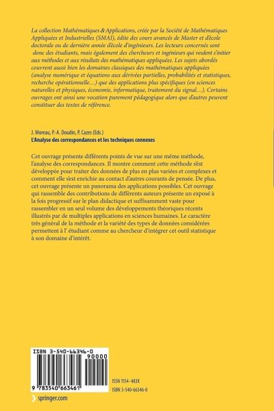 Cet ouvrage présente différents points de vue sur une même méthode, l'analyse des correspondances. Il montre comment cette méthode s'est développée pour traiter des données de plus en plus variées et complexes et comment elle s'est enrichie au contact d'autres courants de pensée. De plus, il présente un panorama des applications possibles. Cet ouvrage qui rassemble des contributions de différents auteurs présente un exposé à la fois progressif sur le plan didactique et suffisamment vaste pour rassembler en un seul volume des développements théoriques récents illustrés par de multiples applications en sciences humaines. Le caractère très général de la méthode et la variété des types de données considérées permettent à l' étudiant comme au chercheur d'intégrer cet outil statistique à son domaine d'intérêt.