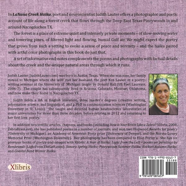 Judith Lauter (JudithLauter.com) was born in Austin, Texas. When she was nine, her family moved to Michigan where she later met her husband, the poet Ken Lauter, in a poetry-writing seminar at the University of Michigan taught by Donald Hall (US Poet Laureate, 2006-7). Th e couple has subsequently lived in the deserts of Arizona, the mountains of Colorado, the prairies of Missouri and Oklahoma, and now make their home in the pineywoods of Nacogdoches TX. Judith holds a BA in English literature, three master's degrees (creative writing, library/information science, and linguistics), and a PhD in communication sciences (Washington University in St. Louis). She taught and directed human neuroscience laboratories at major universities for more than three decades, before retiring in 2012 and returning to her fi rst loves, photography and poetry. In addition to scientifi c articles, chapters, and books (including How is Your Brain Like a Zebra? Xlibris, 2008, ZebraBrain.net), she has published poems in journals, and won two Hopwood Awards for poetry (University of Michigan), an Academy of American Poets prize (University of Denver), and the Norma Lowry Memorial Prize (Washington University). Her prize-winning photography has been compared to Eliot Porter's; reproductions (including selections from this book) are available at FineArtAmerica.com. She has published eight previous books of poetry-and-images with Xlibris, plus a book of photos and poems about Wallace Stevens with the Stephen F. Austin State University Press (see inside for titles).
