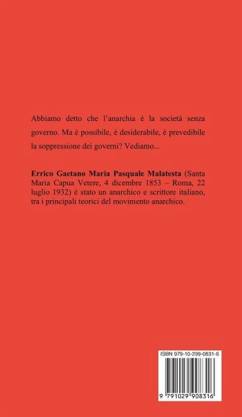Abbiamo detto che l’anarchia è la società senza governo. Ma è possibile, è desiderabile, è prevedibile la soppressione dei governi? Vediamo... Errico Gaetano Maria Pasquale Malatesta (Santa Maria Capua Vetere, 4 dicembre 1853 – Roma, 22 luglio 1932) è stato un anarchico e scrittore italiano, tra i principali teorici del movimento anarchico.