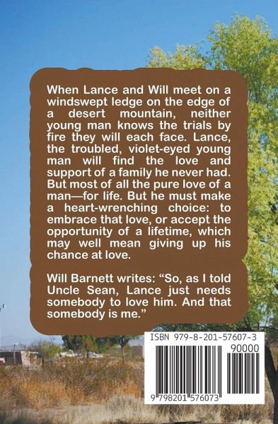 Lance The Early Journals of Will Barnett, Book 2 When Lance and Will meet on a windswept ledge on the edge of a desert mountain, neither young man knows the trials by fire they will each face. Lance, the troubled, violet-eyed young man, who has been abused for many years by his stepfather will find the love and support of a family he never had. But most of all the pure love of a man—for life. But he must make a heart-wrenching choice in the end: to embrace that love, or accept the opportunity of a lifetime, which may well mean giving up his chance at love. Will Barnett writes: "So, as I told Uncle Sean, Lance just needs somebody to love him. And that somebody is me."