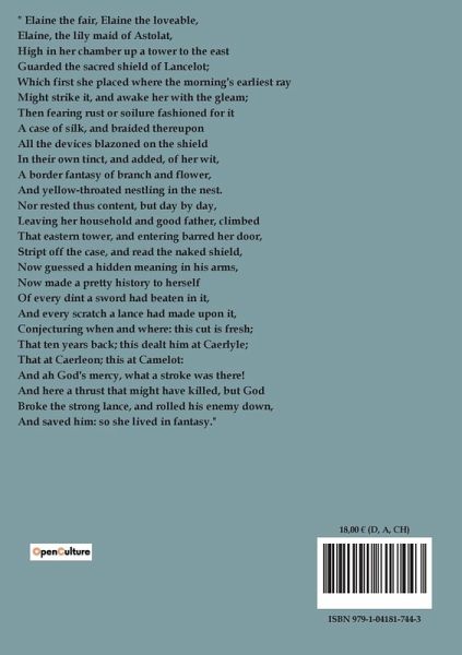 " Elaine the fair, Elaine the loveable, Elaine, the lily maid of Astolat, High in her chamber up a tower to the east Guarded the sacred shield of Lancelot; Which first she placed where the morning's earliest ray Might strike it, and awake her with the gleam; Then fearing rust or soilure fashioned for it A case of silk, and braided thereupon All the devices blazoned on the shield In their own tinct, and added, of her wit, A border fantasy of branch and flower, And yellow-throated nestling in the nest. Nor rested thus content, but day by day, Leaving her household and good father, climbed That eastern tower, and entering barred her door, Stript off the case, and read the naked shield, Now guessed a hidden meaning in his arms, Now made a pretty history to herself Of every dint a sword had beaten in it, And every scratch a lance had made upon it, Conjecturing when and where: this cut is fresh; That ten years back; this dealt him at Caerlyle; That at Caerleon; this at Camelot: And ah God's mercy, what a stroke was there! And here a thrust that might have killed, but God Broke the strong lance, and rolled his enemy down, And saved him: so she lived in fantasy."