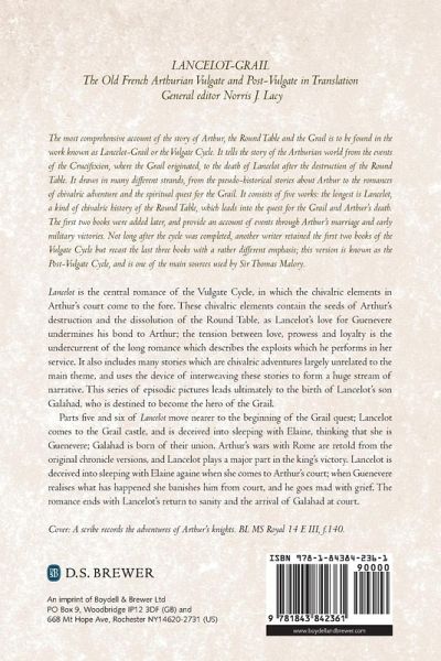 Lancelot is the central romance of the Vulgate Cycle, in which the chivalric elements in Arthur's court come to the fore. These chivalric elements contain the seeds of Arthur's destruction and the dissolution of the Round Table, as Lancelot's love for Guinevere undermines his bond to Arthur; the tension between love, prowess and loyalty is the undercurrent of the long romance which describes the exploits which he performs in her service. It also includes many stories which are chivalric adventures largely unrelated to the main theme, and uses the device of interweaving these stories to form a huge stream of narrative. This series of episodic pictures leads ultimately to the birth of Lancelot's son Galahad, who is destined to become the hero of the Grail. Parts five and six of Lancelot move nearer to the beginning of the Grail quest; Lancelot comes to the Grail castle, and is deceived into sleeping with Elaine, thinking that she is Guinevere; Galahad is born of their union. Arthur's wars with Rome are retold from the original chronicle versions, and Lancelot plays a major part in the king's victory. Lancelot is deceived again when Elaine comes to Arthur's court, and when Guinevere realises that he has slept with Elaine; she banishes him from court, and he goes mad with grief. The romance ends with Lancelot's return to sanity and the arrival of Galahad at court. For a full description of the Vulgate Cycle see the blurb for the complete set.