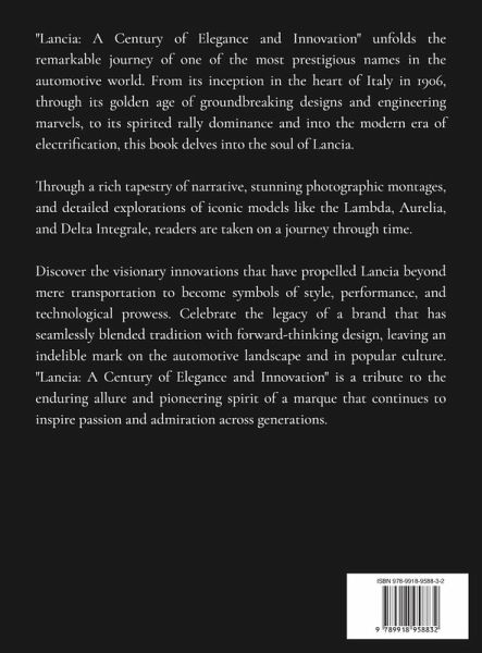 "Lancia: A Century of Elegance and Innovation" unfolds the remarkable journey of one of the most prestigious names in the automotive world. From its inception in the heart of Italy in 1906, through its golden age of groundbreaking designs and engineering marvels, to its spirited rally dominance and into the modern era of electrification, this book delves into the soul of Lancia. Through a rich tapestry of narrative, stunning photographic montages, and detailed explorations of iconic models like the Lambda, Aurelia, and Delta Integrale, readers are taken on a journey through time. Discover the visionary innovations that have propelled Lancia beyond mere transportation to become symbols of style, performance, and technological prowess. Celebrate the legacy of a brand that has seamlessly blended tradition with forward-thinking design, leaving an indelible mark on the automotive landscape and in popular culture. "Lancia: A Century of Elegance and Innovation" is a tribute to the enduring allure and pioneering spirit of a marque that continues to inspire passion and admiration across generations.