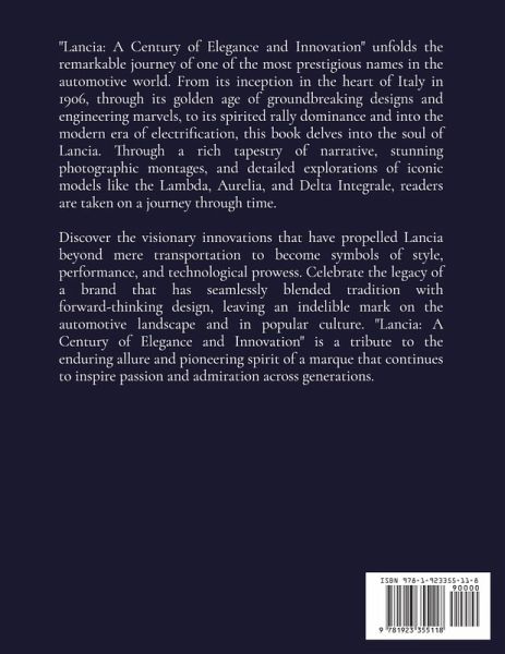 "Lancia: A Century of Elegance and Innovation" unfolds the remarkable journey of one of the most prestigious names in the automotive world. From its inception in the heart of Italy in 1906, through its golden age of groundbreaking designs and engineering marvels, to its spirited rally dominance and into the modern era of electrification, this book delves into the soul of Lancia. Through a rich tapestry of narrative, stunning photographic montages, and detailed explorations of iconic models like the Lambda, Aurelia, and Delta Integrale, readers are taken on a journey through time. Discover the visionary innovations that have propelled Lancia beyond mere transportation to become symbols of style, performance, and technological prowess. Celebrate the legacy of a brand that has seamlessly blended tradition with forward-thinking design, leaving an indelible mark on the automotive landscape and in popular culture. "Lancia: A Century of Elegance and Innovation" is a tribute to the enduring allure and pioneering spirit of a marque that continues to inspire passion and admiration across generations.