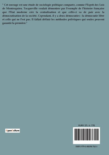 " Cet ouvrage est une étude de sociologie politique comparée, comme l'Esprit des Lois de Montesquieu. Tocqueville voulait démontrer par l'exemple de l'histoire française que l'Etat moderne crée la centralisation et que celle-ci va de pair avec la démocratisation de la société. Cependant, il y a deux démocraties : la démocratie libre et celle qui ne l'est pas. Il fallait définir les méthodes poli-tiques qui seules peuvent garantir la première."