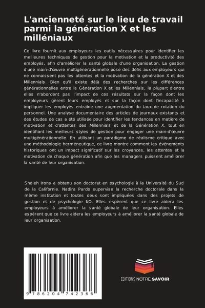 Ce livre fournit aux employeurs les outils nécessaires pour identifier les meilleures techniques de gestion pour la motivation et la productivité des employés, afin d'améliorer la santé globale d'une organisation. La gestion d'une main-d'oeuvre multigénérationnelle pose des défis aux employeurs qui ne connaissent pas les attentes et la motivation de la génération X et des Millennials. Bien qu'il existe déjà des recherches sur les différences générationnelles entre la Génération X et les Millennials, la plupart d'entre elles n'abordent pas l'impact de ces résultats sur la façon dont les employeurs gèrent leurs employés et sur la façon dont l'incapacité à impliquer les employés entraîne une augmentation du taux de rotation du personnel. Une analyse documentaire des articles de journaux existants et des études de cas a été utilisée pour identifier les tendances en matière de motivation et d'attentes des Millennials et de la Génération X, tout en identifiant les meilleurs styles de gestion pour engager une main-d'oeuvre multigénérationnelle. En utilisant un paradigme de réalisme critique avec une méthodologie herméneutique, ce livre montre comment les événements historiques ont un impact significatif sur les croyances, les attentes et la motivation de chaque génération afin que les managers puissent améliorer la santé de leur organisation.