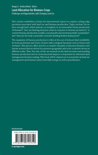 Chapter 1. Introduction.- Chapter 2. Trends in Land Use in Spain and Their Implications to Bioenergy Production.- Chapter 3. Impact of Conservation Compliance on Availability of Land for Corn Stover Harvesting.- Chapter 4. Biophysical Constraints for Land Allocation of Switchgrass (Panicum virgatum L.) and Giant Reed (Arundo donax L.) in Europe, Italy.- Chapter 5. Planning the Next-Generation Biofuel Crops in the U.S. Corn Belt: A Land Suitability Analysis.- Chapter 6. Spatio-temporal Change of Agricultural Biertomass Capacity in the North China Plains.- Chapter 7. Switchgrass Adoption as a Tool for Agro-ecosystem Resilience: Results of a Survey in an Iowa Watershed.- Chapter 8. Farmers' Acreage Responses to Sugarcane Ethanol Industry Expansion.- Chapter 9. Production of Energy Crops in Contaminated Land - Opportunities and Risks.- Chapter 10. Changes in Agricultural Greenhouse Gas Emissions from Cellulosic Biofuel Production.- Chapter 11. Resolving Biomass andFood Security through Land Allocation.