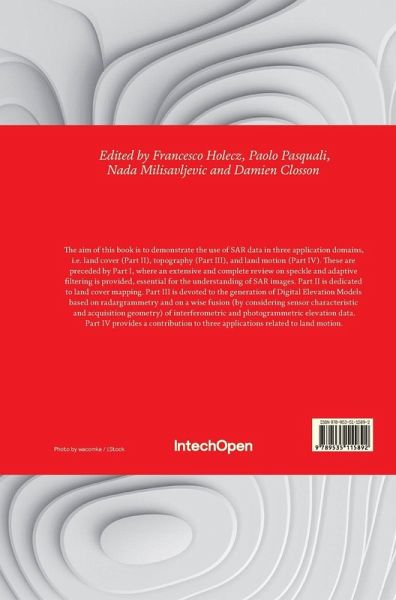 The aim of this book is to demonstrate the use of SAR data in three application domains, i.e. land cover (Part II), topography (Part III), and land motion (Part IV). These are preceded by Part I, where an extensive and complete review on speckle and adaptive filtering is provided, essential for the understanding of SAR images. Part II is dedicated to land cover mapping. Part III is devoted to the generation of Digital Elevation Models based on radargrammetry and on a wise fusion (by considering sensor characteristic and acquisition geometry) of interferometric and photogrammetric elevation data. Part IV provides a contribution to three applications related to land motion.