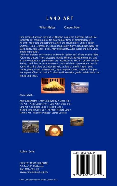 LAND ART A fully illustrated guide to land and environmental art. For the land artist, the whole planet is an artist's studio. The land artist ranges over the whole globe. A desert, a beach, a field, a forest becomes a studio, a place of creative activity. This means the very texture and colour and shape and dampness and springiness and strength and size of moss, for instance. Or a stone. Or a crevice in a rock formation. The way the light falls on a patch of grass, the little bits of dead, yellowish grass on top of the newer, green grass. Pine cones, closed-up. Flowers turning sunward in the late afternoon. These are the things land artists deal with in making art. These are the actualities that artists employ when they create artworks. ? This new book explores all of the major land, environmental and earthwork artists of the past 40 years, including James Turrell and his vast volcano site ¿ Hans Haacke's Conceptual art ¿ Michael Heizer's Mid-West earthworks ¿ Robert Smithson and his giant spiral, entropic earthworks ¿ Christo's wrapped buildings and islands, ¿ Robert Morris's environments ¿ Walter de Maria's Romantic Lightning Field ¿ David Nash's stoves, stones, trees and North Wales environments ¿ Hamish Fulton's walks and words ¿ Dennis Oppenheim's concentric snow circles ¿ Richard Long and his art of walking ¿ Andy Goldsworthy's natural, spontaneous, eco-friendly sculptures ¿ Alice Aycock's mysterious underground mazes ¿ Mary Miss's sunken pools and pavilions ¿ Wolfgang Laib's delicate, luminous pollen spreads ¿ Nancy Holt and her observation sculptures ¿ and the enigmatic floor sculptures of Carl Andre. Here are towers, stars, stones, pools, tunnels, pipes,maps, chasms, ladders, mounds, scars, mirrors, cones, furrows, mazes, circles, hills and gardens. ?