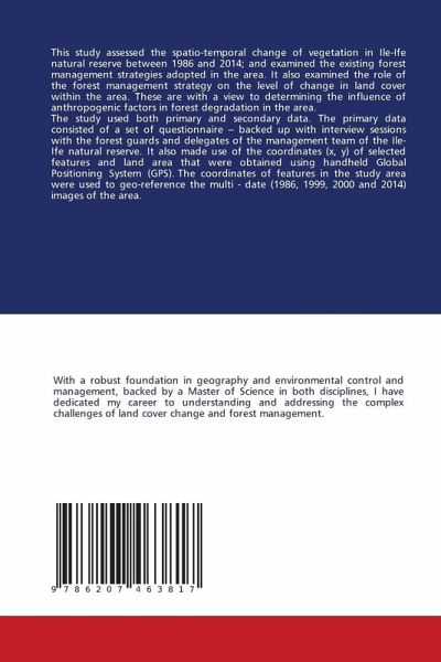 This study assessed the spatio-temporal change of vegetation in Ile-Ife natural reserve between 1986 and 2014; and examined the existing forest management strategies adopted in the area. It also examined the role of the forest management strategy on the level of change in land cover within the area. These are with a view to determining the influence of anthropogenic factors in forest degradation in the area.The study used both primary and secondary data. The primary data consisted of a set of questionnaire - backed up with interview sessions with the forest guards and delegates of the management team of the Ile-Ife natural reserve. It also made use of the coordinates (x, y) of selected features and land area that were obtained using handheld Global Positioning System (GPS). The coordinates of features in the study area were used to geo-reference the multi - date (1986, 1999, 2000 and 2014) images of the area.