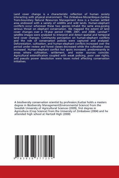 Land cover change is a characteristic reflection of human society interacting with physical environment. The Zimbabwe-Mozambique-Zambia Trans-boundary Natural Resources Management Area is a human settled area endowed with a variety of wildlife and wild lands. Human-elephant conflicts occur whenever these two species inhabit the same area,posing serious threat on elephant conservation. We mapped the extent of land cover changes over a 19-year period (1989, 2001, and 2008). Landsat satellite images were analyzed to interpret and detect spatial and temporal land cover changes. Community perception on human-elephant conflicts and the role of conservation policies were captured and analyzed. Deforestation, cultivation, and human-elephant conflicts increased over the period under review and forest classes decreased while the cultivation class increased. Human-elephant conflict hot spots increased, predominantly in areas where cultivation, settlement, and water sources coincide. Agricultural extensification coupled with weak policing, poor user rights, and pseudo power devolution were issues noted affecting conservation initiatives.