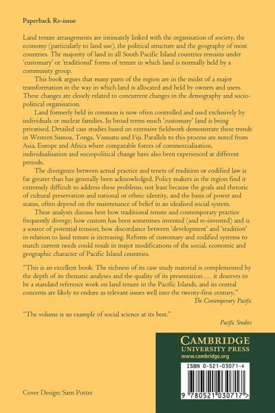 Land tenure arrangements are intimately linked with the organization of society, the economy, political structures and geography. In the South Pacific Islands the majority of land is held by community groups under 'customary' or 'traditional' forms of tenure. This book argues that land formerly held in common is now often controlled and used exclusively by individuals or nuclear families - it is being privatized. Detailed case studies demonstrate these trends in Western Samoa, Tonga, Vanuatu and Fiji. Parallels are noted from Asia, Europe and Africa, where comparable forces of commercialization, individualization and socio-political change have brought comparable results. The denial of these trends by policy makers in the region reflects an interest in maintaining the image of traditionalism and its associated status and power. The divergence between rhetoric and reality creates dilemmas for many Pacific Islanders and their leaders.