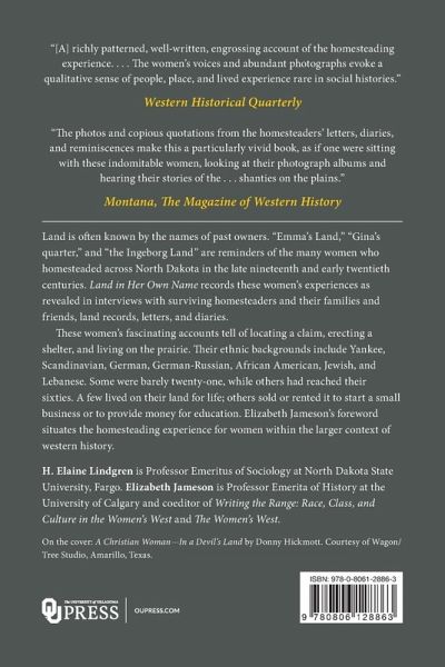 Land is often known by the names of past owners. ""Emma's Land,"" ""Gina's quarter,"" and ""the Ingeborg Land"" are reminders of the many women who homesteaded across North Dakota in the late nineteenth and early twentieth centuries. Land in Her Own Name records these homesteaders' experiences as revealed in interviews with surviving homesteaders and their families and friends, land records, letters, and diaries. These women's fascinating accounts tell of locating a claim, erecting a shelter, and living on the prairie. Their ethnic backgrounds include Yankee, Scandinavian, German, and German-Russian, as well as African American, Jewish, and Lebanese. Some were barely twenty-one, while others had reached their sixties. A few lived on their land for life and ""never borrowed a cent against it""; others sold or rented the land to start a small business or to provide money for education. For this paperback edition, Elizabeth Jameson's foreword situates the homesteading experience for women within the larger context of western history.