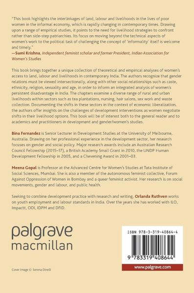 Chapter 1. Against the grain: Indian women negotiate land, labour and livelihoods in the new millennium; Bina Fernandez, Orlanda Ruthven and Meena Gopal.- Section I.Owning Land, Disowning Women.- Chapter 2. Tribal women organising for land rights in Dahod and Panchmahaals, Gujarat; Sita Mamidipudi and Sejal Dand.- Chapter 3. Securing land rights for women: government land allocation in Odisha; Sonali Mohapatra.- Chapter 4. Deserted and widowed women's struggle for land and livelihood: a case from Maharashtra; Sneha Bhat.- Chapter 5. Claiming space, claiming rights: Inheritance and land rights for Muslim women in Uttar Pradesh, India; Niti Saxena and Soma K. Parthasarathy.- Section II. Marginalised and stigmatised labour.- Chapter 6. Female labour in tea plantations: Labour process and labour control; Ashmita Sharma.- Chapter 7. Sex work as livelihood: Women, men, and transgender sex workers in Karnataka; Shubha Chacko, Subadra Panchanadeswaran, Gowri Vijayakumar.- Chapter 8. Nhavi women in Pune city: renegotiating new opportunities for livelihood; Archana Zende.- Section III. Education, mobility and skills.- Chapter 9. Karma and the myth of the new Indian Super Woman: Missing women in the Indian Workforce; Bhavani Arabandi.- Chapter 10. "Here, we are addicted to loitering": exploring narratives of work and mobility among migrant women in Delhi; Sonal Sharma and Eesha Kunduri.- Chapter 11. All aboard the Job Train: Government-funded training and recruitment in India's apparel industry; Orlanda Ruthven.- Chapter 12:Care (un)skilled: fragmented labour markets in nursing, contemporary Kolkata; Panchali Ray.- Section IV - Collective strategies.- Chapter 13:Making waste matter: Re-imagining urban renewal and advocating for waste-pickers' right to a dignified livelihood; Sohnee Harshey and PratibhaSharma.- Chapter 14:Self-Employment, waged or unpaid work: influences on the choices of poor women; Dimple Tresa Abraham.- Chapter 15:Renegotiating patriarchal bargains? Rural women's collective livelihood initiatives in India; Bina Fernandez.