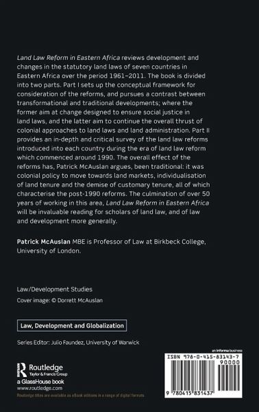 Land Law Reform in East Africa reviews development and changes in the statutory land laws of 7 countries in Eastern Africa over the period 1961 - 2011. The book is divided into two parts. Part 1 sets up the conceptual framework for consideration of the reforms, and pursues a contrast between transformational and traditional developments; where the former aim at change designed to ensure social justice in land laws, and the latter aim to continue the overall thrust of colonial approaches to land laws and land administration. Part 2 provides an in-depth and critical survey of the land law reforms introduced into each country during the era of land law reform which commenced around 1990. The overall effect of the reforms has, Patrick McAuslan argues, been traditional: it was colonial policy to move towards land markets, individualisation of land tenure and the demise of customary tenure, all of which characterise the post 1990 reforms. The culmination of over 50 years of working in this area, Land Law Reform in East Africa will be invaluable reading for scholars of land law, and of law and development more generally.