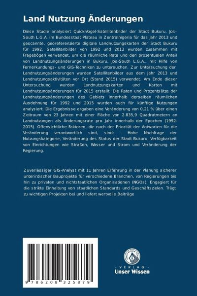 Diese Studie analysiert Quick-Vogel-Satellitenbilder der Stadt Bukuru, Jos-South L.G.A. im Bundesstaat Plateau in Zentralnigeria für das Jahr 2013 und gescannte, georeferenzierte digitale Landnutzungskarten der Stadt Bukuru für 1992. Satellitenbilder von 1992 und 2013 wurden zusammen mit Fragebögen verwendet, um die räumliche Rate und den prozentualen Anteil von Landnutzungsänderungen in Bukuru, Jos-South L.G.A., mit Hilfe von Fernerkundungs- und GIS-Techniken zu untersuchen. Zur Untersuchung der Landnutzungsänderungen wurden Satellitenbilder aus dem Jahr 2013 und Landnutzungsaktivitäten vor Ort (Stand 2015) verwendet. Am Ende dieser Untersuchung wurden Landnutzungskarten und Karten mit Landnutzungsänderungen für 2015 erstellt. Die Raten und Prozentsätze der Landnutzungsänderungen des Gebiets innerhalb derselben räumlichen Ausdehnung für 1992 und 2015 wurden auch für künftige Nutzungen analysiert. Die Ergebnisse ergaben eine Veränderung von 0,21 % über einen Zeitraum von 23 Jahren mit einer Fläche von 2.835,9 Quadratmetern an Landnutzungen als Änderungsrate pro Jahr innerhalb der Epochen (1992-2015). Offensichtliche Faktoren, die nach der Priorität der Antworten für die Veränderung verantwortlich sind, sind: - Hohe Nachfrage der Nutzungskategorie, Veränderung des Status der Stadt Bukuru, Verfügbarkeit von Einrichtungen wie Straßen, Wasser und Strom und Veränderung der Regierung.