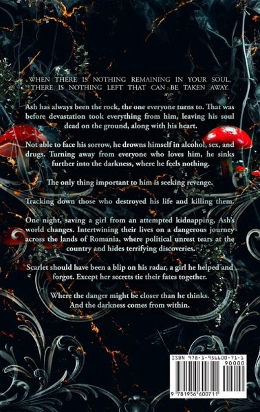 When there is nothing remaining in your soul, there is nothing left that can be taken away. Ash has always been the rock, the one everyone turns too. That was before devastation took everything from him, leaving his soul dead on the ground, along with his heart. Not able to face his sorrow, he drowns himself in alcohol, sex, and drugs. Turning away from everyone who loves him, he sinks further into the darkness, where he feels nothing. The only thing important to him is seeking revenge. Tracking down those who destroyed his life and killing them. One night, saving a girl from an attempted kidnapping, Ash's world changes. Intwining their lives on a dangerous journey across the lands of Romania, where political unrest tears at the country and hides terrifying discoveries. Scarlet should have been a blimp on his radar, a girl he helped and forgot. Except her secrets tie their fates together. Where the danger might be closer than he thinks. And the darkness comes from within.
