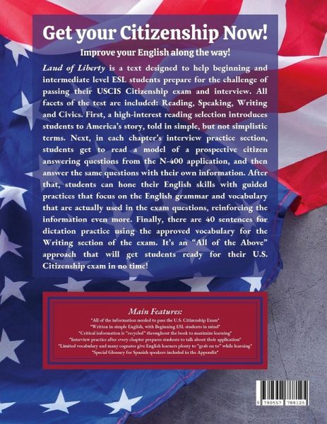 Land of Liberty is a text designed to prepare beginning ESL students for the challenge of passing their USCIS Citizenship Exam. All facets of the test are included: Reading, Civics, Speaking, and Writing. First, a high-interest reading selection introduces students to America's story, told in simple, but not simplistic terms. Next, in each chapter's interview practice section, students get the chance to read a model of a prospective citizen going through his Citizenship interview and then practice with their own information. Then, students can hone their English skills with guided practice that focuses on the English grammar and vocabulary that is actually used in the test, reinforcing the information even more. Finally, there are 40 sentences for dictation practice using all the vocabulary designated for the Writing portion of the official Citizenship Exam. It's an "All-of-the-Above" approach to get students ready to become new U.S. citizens in no time!