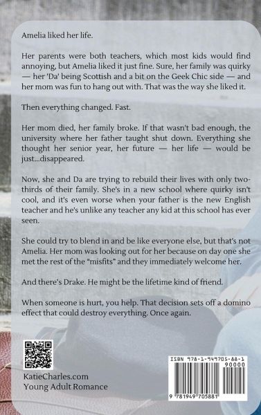 Amelia liked her life. Her parents were both teachers, which most kids would find annoying, but Amelia liked it just fine. Sure, her family was quirky - her 'Da' being Scottish and a bit on the Geek Chic side - and her mom was fun to hang out with. That was the way she liked it. Then everything changed. Fast. Her mom died, her family broke. If that wasn't bad enough, the university where her father taught shut down. Everything she thought her senior year, her future - her life - would be just...disappeared. Now, she and Da are trying to rebuild their lives with only two-thirds of their family. She's in a new school where quirky isn't cool, and it's even worse when your father is the new English teacher and he's unlike any teacher any kid at this school has ever seen. She could try to blend in and be like everyone else, but that's not Amelia. Her mom was looking out for her because on day one she met the rest of the "misfits" and they immediately welcome her. And there's Drake. He might be the lifetime kind of friend. When someone is hurt, you help. That decision sets off a domino effect that could destroy everything. Once again.