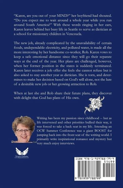 "Karen, are you out of your MIND?" her boyfriend had shouted. "Do you expect me to wait around a whole year while you run around South America?" With these words ringing in her ears, Karen leaves behind her busy life in Seattle to serve as dietician at a school for missionary children in Venezuela. The new job, already complicated by the unavailability of certain foods, undependable electricity, and polluted water, is made all the more interesting by her handsome co-worker, Rob. Karen vows to keep a safe emotional distance since they will go their separate ways at the end of the year. Her plans are challenged, however, when her former position in the states is suddenly terminated. Karen later receives a job offer she feels she cannot refuse but is also asked to stay another year as dietician. She is torn, and determines to make her decision based on God's will alone, not the lure of a desirable new job or her growing attraction to Rob. When at last she and Rob share their future plans, they discover with delight that God has plans of His own.