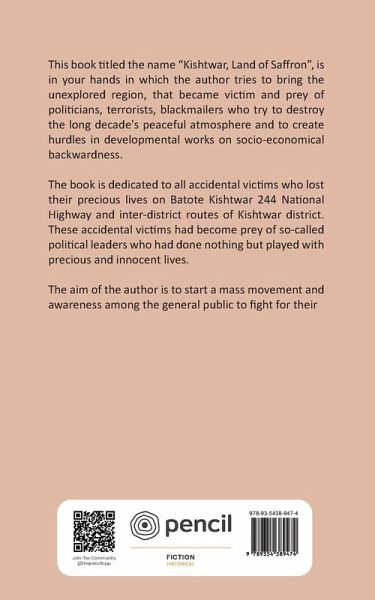 This book titled the name "Kishtwar, Land of Saffron", is in your hands in which the author tries to bring the unexplored region, that became victim and prey of politicians, terrorists, blackmailers who try to destroy the long decade's peaceful atmosphere and to create hurdles in developmental works on socio-economical backwardness. The book is dedicated to all accidental victims who lost their precious lives on Batote Kishtwar 244 National Highway and inter-district routes of Kishtwar district. These accidental victims had become prey of so-called political leaders who had done nothing but played with precious and innocent lives. The aim of the author is to start a mass movement and awareness among the general public to fight for their