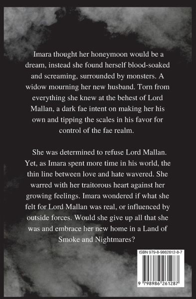 Imara thought her honeymoon would be a dream, instead she found herself blood-soaked and screaming, surrounded by monsters. A widow mourning her new husband. Torn from everything she knew at the behest of Lord Mallan, a dark fae intent on making her his own and tipping the scales in his favor for control of the fae realm. She was determined to refuse Lord Mallan. Yet, as Imara spent more time in his world, the thin line between love and hate wavered. She warred with her traitorous heart against her growing feelings. Imara wondered if what she felt for Lord Mallan was real, or influenced by outside forces. Would she give up all that she was and embrace her new home in a Land of Smoke and Nightmares?