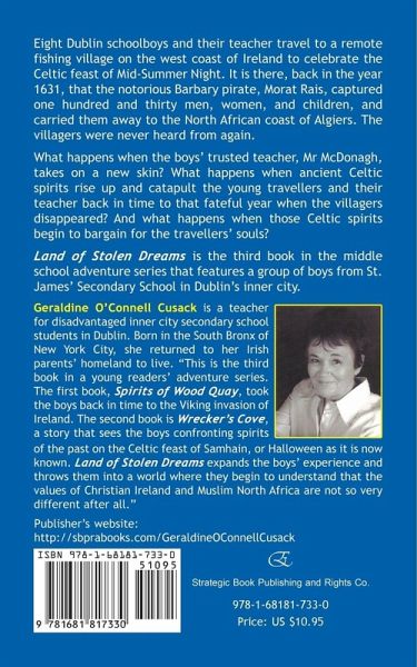 Eight Dublin schoolboys and their teacher travel to a remote fishing village on the west coast of Ireland to celebrate the Celtic feast of Mid-Summer Night. It is there, back in the year 1631, that the notorious Barbary pirate, Morat Rais, captured one hundred and thirty men, women, and children, and carried them away to the North African coast of Algiers. The villagers were never heard from again. What happens when the boys' trusted teacher, Mr McDonagh, takes on a new skin? What happens when ancient Celtic spirits rise up and catapult the young travellers and their teacher back in time to that fateful year when the villagers disappeared? And what happens when those Celtic spirits begin to bargain for the travellers' souls? Land of Stolen Dreams is the third book in the middle school adventure series that features a group of boys from St. James' Secondary School in Dublin's inner city. Geraldine O'Connell Cusack is a teacher for disadvantaged inner city secondary school students in Dublin. Born in the South Bronx of New York City, she returned to her Irish parents' homeland to live. "This is the third book in a young readers' adventure series. The first book, Spirits of Wood Quay, took the boys back in time to the Viking invasion of Ireland. The second book is Wrecker's Cove, a story that sees the boys confronting spirits of the past on the Celtic feast of Samhain, or Halloween as it is now known. Land of Stolen Dreams expands the boys' experience and throws them into a world where thy begin to understand that the values of Christian Ireland and Muslim North Africa are not so very different after all." Publisher's website: http://sbprabooks.com/GeraldineOConnellCusack