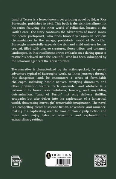 ""Land of Terror"" is an enthralling adventure novel written by Edgar Rice Burroughs, celebrated for its gripping narrative and imaginative world-building. Set in a prehistoric landscape teeming with danger and mystery, the story follows the protagonist, Lieutenant Frederic Carson, and his companions as they embark on a daring expedition to explore the uncharted regions of Antarctica. However, their journey takes a perilous turn when they become stranded in a hidden valley inhabited by prehistoric creatures and savage tribes. As they struggle to survive in this hostile environment, Carson and his companions must confront their deepest fears and overcome numerous challenges, including encounters with ferocious beasts, treacherous terrain, and rival explorers. With its blend of action, suspense, and adventure, ""Land of Terror"" transports readers to a world of thrilling escapades and pulse-pounding excitement, where the spirit of exploration knows no bounds and the mysteries of the ancient world await discovery.