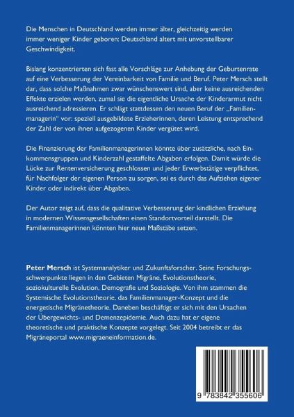 Die Menschen in Deutschland werden immer älter, gleichzeitig werden immer weniger Kinder geboren: Deutschland altert mit unvorstellbarer Geschwindigkeit. Bislang konzentrieren sich fast alle Vorschläge zur Anhebung der Geburtenrate auf eine Verbesserung der Vereinbarkeit von Familie und Beruf. Peter Mersch stellt dar, dass solche Maßnahmen zwar wünschenswert sind, aber keine ausreichenden Effekte erzielen werden, zumal sie die eigentliche Ursache der Kinderarmut nicht ausreichend adressieren. Er schlägt stattdessen den neuen Beruf der "Familienmanagerin" vor: speziell ausgebildete Erzieherinnen, deren Leistung entsprechend der Zahl der von ihnen aufgezogenen Kinder vergütet wird. Die Finanzierung der Familienmanagerinnen könnte über zusätzliche, nach Einkommensgruppen und Kinderzahl gestaffelte Abgaben erfolgen. Damit würde die Lücke zur Rentenversicherung geschlossen und jeder Erwerbstätige verpflichtet, für Nachfolger der eigenen Person zu sorgen, sei es durch das Aufziehen eigener Kinder oder indirekt über Abgaben. Der Autor zeigt auf, dass die qualitative Verbesserung der kindlichen Erziehung in modernen Wissensgesellschaften einen Standortvorteil darstellt. Die Familienmanagerinnen könnten hier neue Maßstäbe setzen. 2. unveränderte Auflage der Erstausgabe aus 2006