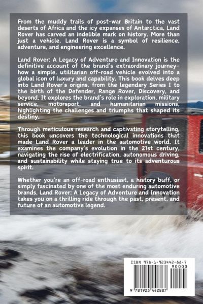 From the muddy trails of post-war Britain to the vast deserts of Africa and the icy expanses of Antarctica, Land Rover has carved an indelible mark on history. More than just a vehicle, Land Rover is a symbol of resilience, adventure, and engineering excellence. Land Rover: A Legacy of Adventure and Innovation is the definitive account of the brand's extraordinary journey-how a simple, utilitarian off-road vehicle evolved into a global icon of luxury and capability. This book delves deep into Land Rover's origins, from the legendary Series I to the birth of the Defender, Range Rover, Discovery, and beyond. It explores the brand's role in exploration, military service, motorsport, and humanitarian missions, highlighting the challenges and triumphs that shaped its destiny. Through meticulous research and captivating storytelling, this book uncovers the technological innovations that made Land Rover a leader in the automotive world. It examines the company's evolution in the 21st century, navigating the rise of electrification, autonomous driving, and sustainability while staying true to its adventurous spirit. Whether you're an off-road enthusiast, a history buff, or simply fascinated by one of the most enduring automotive brands, Land Rover: A Legacy of Adventure and Innovation takes you on a thrilling ride through the past, present, and future of an automotive legend.