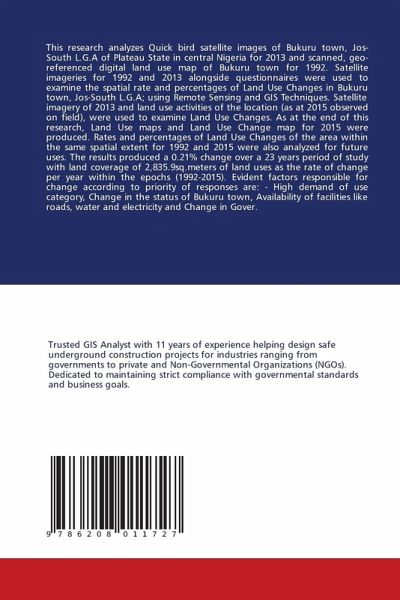 This research analyzes Quick bird satellite images of Bukuru town, Jos-South L.G.A of Plateau State in central Nigeria for 2013 and scanned, geo-referenced digital land use map of Bukuru town for 1992. Satellite imageries for 1992 and 2013 alongside questionnaires were used to examine the spatial rate and percentages of Land Use Changes in Bukuru town, Jos-South L.G.A; using Remote Sensing and GIS Techniques. Satellite imagery of 2013 and land use activities of the location (as at 2015 observed on field), were used to examine Land Use Changes. As at the end of this research, Land Use maps and Land Use Change map for 2015 were produced. Rates and percentages of Land Use Changes of the area within the same spatial extent for 1992 and 2015 were also analyzed for future uses. The results produced a 0.21% change over a 23 years period of study with land coverage of 2,835.9sq.meters of land uses as the rate of change per year within the epochs (1992-2015). Evident factors responsible for change according to priority of responses are: - High demand of use category, Change in the status of Bukuru town, Availability of facilities like roads, water and electricity and Change in Gover.