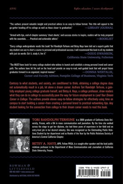 It is clear that the path from college to work has changed dramatically in recent years—current statistics show that half of young college graduates are either jobless or underemployed in positions that don’t fully use their skills and knowledge. But landing a good job is not impossible! Authors Tori Randolph Terhune, a gainfully-employed young college graduate herself, and Betsy A. Hays, a college professor, show readers what they can do in college to successfully pave the way for future employment. The authors provide eleven easy-to-follow strategies for students to effectively use time on campus to start building a career.