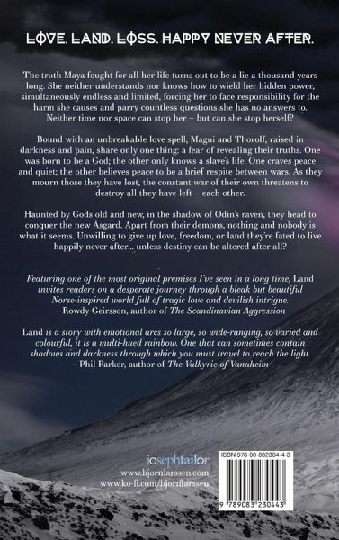 Love. Land. Loss. Happy Never After. The truth Maya fought for all her life turns out to be a lie a thousand years long. She neither understands nor knows how to wield her hidden power, simultaneously endless and limited, forcing her to face responsibility for the harm she causes and parry countless questions she has no answers to. Neither time nor space can stop her - but can she stop herself? Bound with an unbreakable love spell, Magni and Thorolf, raised in darkness and pain, share only one thing: a fear of revealing their truths. One was born to be a God; the other only knows a slave's life. One craves peace and quiet; the other believes peace to be a brief respite between wars. As they mourn those they have lost, the constant war of their own threatens to destroy all they have left - each other. Haunted by Gods old and new, in the shadow of Odin's raven, they head to conquer the new Ásgard. Apart from their demons, nothing and nobody is what it seems. Unwilling to give up love, freedom, or land, they're fated to live happily never after... unless destiny can be altered after all?