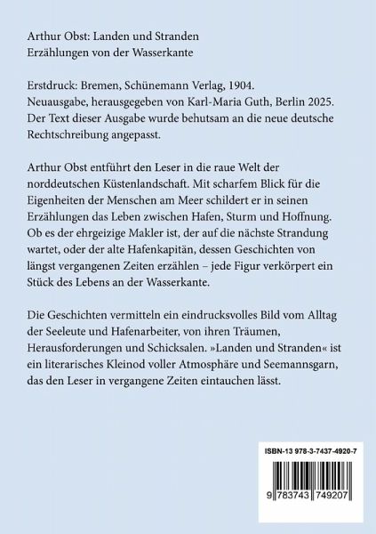 Arthur Obst: Landen und Stranden. Erzählungen von der Wasserkante Arthur Obst entführt den Leser in die raue Welt der norddeutschen Küstenlandschaft. Mit scharfem Blick für die Eigenheiten der Menschen am Meer schildert er in seinen Erzählungen das Leben zwischen Hafen, Sturm und Hoffnung. Ob es der ehrgeizige Makler ist, der auf die nächste Strandung wartet, oder der alte Hafenkapitän, dessen Geschichten von längst vergangenen Zeiten erzählen - jede Figur verkörpert ein Stück des Lebens an der Wasserkante. Die Geschichten, erstmals 1904 veröffentlicht, vermitteln ein eindrucksvolles Bild vom Alltag der Seeleute und Hafenarbeiter, von ihren Träumen, Herausforderungen und Schicksalen. »Landen und Stranden« ist ein literarisches Kleinod voller Atmosphäre und Seemannsgarn, das den Leser in vergangene Zeiten eintauchen lässt. Erstdruck: Bremen, Schünemann Verlag, 1904. Neuausgabe, herausgegeben von Karl-Maria Guth, Berlin 2025. Der Text dieser Ausgabe wurde behutsam an die neue deutsche Rechtschreibung angepasst. Gesetzt aus der Minion Pro, 11 pt. Henricus - Edition Deutsche Klassik GmbH