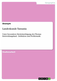 Studienarbeit aus dem Jahr 2010 im Fachbereich Geowissenschaften / Geographie - Politische Geographie, Note: 1,7, Hochschule Bremen, Sprache: Deutsch, Abstract: In dieser Hausarbeit geht es zum einen um das sozio-geografische Thema 'Was sind Entwicklungsländer?'. Erklärt wird dies auch am Beispiel Tansanias, was das andere Thema der Arbeit darstellt. Das Land wird unter folgenden Gesichtspunkten vorgestellt: Allgemeine Daten, Kultur- und Sozialgeografie, Wirtschaftsgeographie und Physische Geografie. Ein besonderer Schwerpunkt liegt zudem auf dem Thema Tourismus.