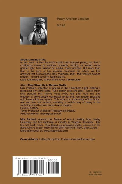 Award winning poet, Nita Penfold's second full length book of poetry. Nita Penfold received her Master of Arts in Writing from Lesley University and her doctorate in ministry at Wisdom University. Her first full-length book, They Stand Up in Broken Shells, earned her the 2006 Writer's Digest International Self-Published Poetry Book Award. More information at: www.nitapenfold.com.About Landing in Oz: In this book of Nita Penfold's soulful and intrepid poetry, we find a contiguous series of luscious moments, inching us toward some greater light; here familiar or familial, there abstract. But more than that, in the germ of her impartial reverence for nature, we find answers that acknowledge then challenge grief - that venture beyond reason- toward genuine, legitimate joy. Leda Joandaughter, author of the novel, Tao of Love