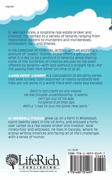 O. Wendell Pickle, a longtime real estate broker and investor, has rented to a variety of tenants ranging from responsible citizens to murderers and murderesses, embezzlers, liars, and thieves. In his collection of limericks, written with an exorbitant amount of "poetic" license, Pickle offers a glimpse into what it is like to be a landlord in America while sharing some of the hundreds of creative excuses he has been offered by tenants-with and without a straight face-for not paying their rent either on time or at all. Landlords' Lament is a compilation of amusing verses that seek to help both seasoned or novice landlords feel they are not alone in a world filled with really bad excuses. Rent is not credit by any means.He has trouble understanding, it seems.He'll go out of his wayTo spend it all that dayWith a "I had to buy me some new jeans."