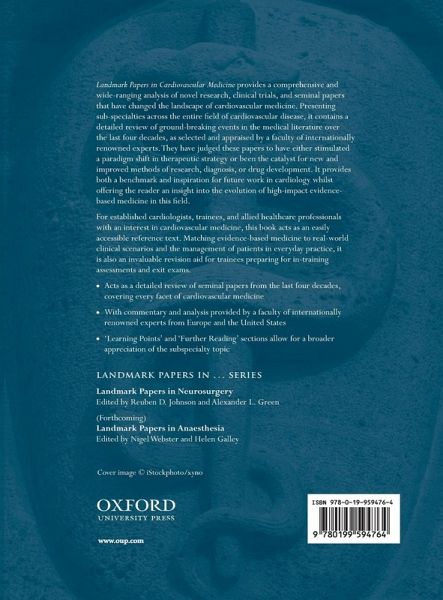 Landmark Papers in Cardiovascular Medicine provides a thorough and wide-ranging analysis of core examples of novel research, clinical trials and seminal papers published in the medical literature that have paved the way for breakthroughs in the management of the entire spectrum of cardiovascular disease. These papers may have produced positive, negative or equivocal findings but are regarded by the experts as having either stimulated a paradigm shift in therapeutic strategy or been the catalyst for new and improved methods of research, diagnosis or drug development. Our aim is to provide both a benchmark and inspiration for future work in the field of cardiovascular medicine and also to give the reader an insight into the mechanics and infrastructure of how high-quality evidence-based medicine has been produced. Each trial summary is punctuated by sections on 'strengths and limitations', 'impact on the field', 'learning points' and 'further reading' suggestions that allow for a completely holistic analysis of the data. The experts also give their views on what research is currently underway, their hopes for the future and what advances they predict will occur in each subspecialty field of cardiovascular medicine, making this book essential reading for all those individuals with an interest in the field.
