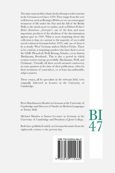 The nine essays in this volume deal with major achievements in the German novel since 1959. They range from the very well known, such as Brussig's Helden wie wir, an extravagant treatment of life under the Stasi and the fall of the Berlin Wall, to the much more recondite, such as Hubert Fichte's Detlevs Imitationen «Grünspan», one of the first, and most important, products of the abolition of the discrimination against gays in 1969. What is most surprising about this collection is that, in contrast to the majority of successful novels written in German before 1959, only one of these is by a clearly 'West' German author: Hubert Fichte. There is, by contrast, a surprising number who have their roots in the GDR (Plenzdorf, Wolf, Brussig, Schulze), or in Austria (Bachmann, Bernhard). This is also a period in which women writers emerge powerfully (Bachmann, Wolf, and Özdamar). Virtually all these novels aroused controversy in some quarters at the time of their publication, often for their treatment of semi-taboo, or at least uncomfortable, subject-matter.