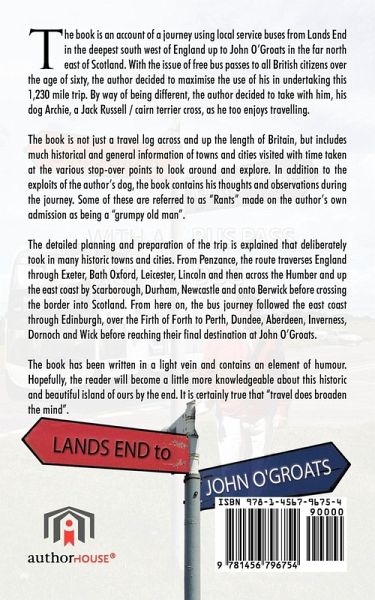 The book is an account of a journey using local service buses from Lands End in the deepest south west of England up to John O'Groats in the far north east of Scotland. With the issue of free bus passes to all British citizens over the age of sixty, the author decided to maximise the use of his in undertaking this 1,230 mile trip. By way of being different, the author decided to take with him, his dog Archie, a Jack Russell / cairn terrier cross, as he too enjoys travelling. The book is not just a travel log across and up the length of Britain, but includes much historical and general information of towns and cities visited with time taken at the various stop-over points to look around and explore. In addition to the exploits of the author's dog, the book contains his thoughts and observations during the journey. Some of these are referred to as "Rants" made on the author's own admission as being a "grumpy old man". The detailed planning and preparation of the trip is explained that deliberately took in many historic towns and cities. From Penzance, the route traverses England through Exeter, Bath Oxford, Leicester, Lincoln and then across the Humber and up the east coast by Scarborough, Durham, Newcastle and onto Berwick before crossing the border into Scotland. From here on, the bus journey followed the east coast through Edinburgh, over the Firth of Forth to Perth, Dundee, Aberdeen, Inverness, Dornoch and Wick before reaching their final destination at John O'Groats. The book has been written in a light vein and contains an element of humour. Hopefully, the reader will become a little more knowledgeable about this historic and beautiful island of ours by the end. It is certainly true that "travel does broaden the mind".