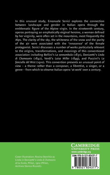 In this unusual study, Emanuele Senici explores the connection between landscape and gender in Italian opera through the emblematic figure of the Alpine virgin. In the nineteenth century, operas portraying an emphatically virginal heroine, a woman defined by her virginity, were often set in the mountains, most frequently the Alps. The clarity of the sky, the whiteness of the snow and the purity of the air were associated with the 'innocence' of the female protagonist. Senici discusses a number of works particularly relevant to the origins, transformations and meanings of this conventional association including Bellini's La sonnambula (1831), Donizetti's Linda di Chamounix (1842), Verdi's Luisa Miller (1849), and Puccini's La fanciulla del West (1910). This convention presents an unusual point of view - a theme rather than a composer, a librettist, a singer or a genre - from which to observe Italian opera 'at work' over a century.