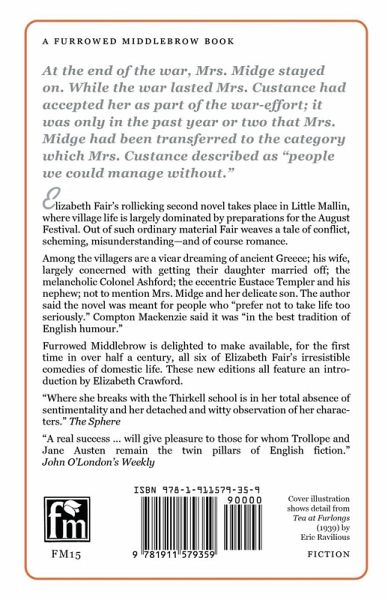 At the end of the war, Mrs. Midge stayed on. While the war lasted Mrs. Custance had accepted her as part of the war-effort; it was only in the past year or two that Mrs. Midge had been transferred to the category which Mrs. Custance described as "people we could manage without." Elizabeth Fair’s rollicking second novel takes place in Little Mallin, where village life is largely dominated by preparations for the August Festival. Out of such ordinary material Fair weaves a tale of conflict, scheming, misunderstanding—and of course romance. Among the villagers are a vicar dreaming of ancient Greece; his wife, largely concerned with getting their daughter married off; the melancholic Colonel Ashford; the eccentric Eustace Templer and his nephew; not to mention Mrs. Midge and her delicate son. The author said the novel was meant for people who "prefer not to take life too seriously." Compton Mackenzie said it was "in the best tradition of English humour." Furrowed Middlebrow is delighted to make available, for the first time in over half a century, all six of Elizabeth Fair’s irresistible comedies of domestic life. These new editions all feature an introduction by Elizabeth Crawford. "Where she breaks with the Thirkell school is in her total absence of sentimentality and her detached and witty observation of her characters."--The Sphere "A real success … will give pleasure to those for whom Trollope and Jane Austen remain the twin pillars of English fiction."--John O’London’s Weekly
