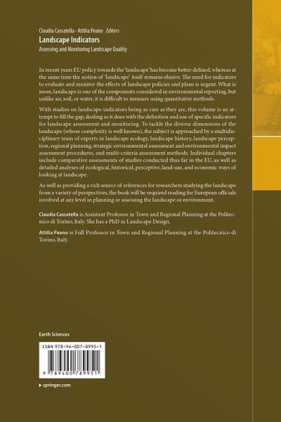 With studies on landscape indicators being as rare as they are, this volume is an attempt to fill the gap, dealing as it does with the definition and use of specific indicators for landscape assessment and monitoring. To tackle the diverse dimensions of the landscape (whose complexity is well known), the subject is approached by a multidisciplinary team of experts in landscape ecology, landscape history, landscape perception, regional planning, strategic environmental assessment and environmental impact assessment procedures, and multi-criteria assessmentmethods. Individual chapters include comparative assessments of studies conducted thus far in the EU, as well as detailed analyses of ecological, historical, perceptive, land-use, and economic ways of looking at landscape.