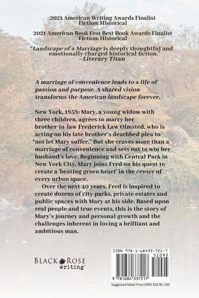 "Landscape of a Marriage is a historical fiction masterpiece. Mary and Fred's relationship is wonderfully depicted and the history that is woven into this book is done so intricately and commendably." -Ellie Yarde, reviewer for the award-winning Coffee Pot Book Club A marriage of convenience leads to a life of passion and purpose. A shared vision transforms the American landscape forever. New York, 1858: Mary, a young widow with three children, agrees to marry her brother-in-law Frederick Law Olmsted, who is acting on his late brother's deathbed plea to "not let Mary suffer." But she craves more than a marriage of convenience and sets out to win her husband's love. Beginning with Central Park in New York City, Mary joins Fred on his quest to create a 'beating green heart' in the center of every urban space. Over the next 40 years, Fred is inspired to create dozens of city parks, private estates and public spaces with Mary at his side. Based upon real people and true events, this is the story of Mary's journey and personal growth and the challenges inherent in loving a brilliant and ambitious man.