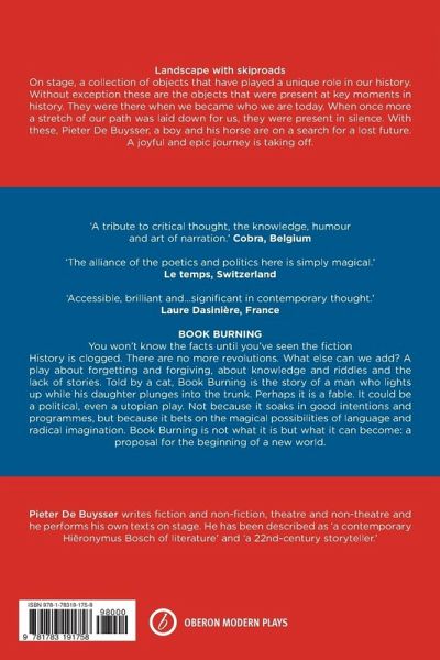 Landscape with Skiproads On stage, a collection of objects that have played a unique role in our history. Without exception these are the objects that were present at key moments in history. They were there when we became who we are today. When once more a stretch of our path was laid down for us, they were present in silence. With these, Pieter De Buysser, a boy and his horse are on a search for a lost future. A joyful and epic journey is taking off. Book Burning History is clogged. There are no more revolutions. What else can we add? In Book Burning, Pieter De Buysser tells the story of Sebastian, a man he met at an Occupy demonstration, whose life has become embroiled in a WikiLeaks scandal. He follows the man's search to discover the root of a genetic illness that took the life of his wife and now threatens his daughter, Tilda. She just wants to forget it all. This is a play about forgetting and forgiving, knowledge and riddles, secrets and the lack of stories. It is a captivating fable, told by a charming storyteller in the guise of Schrödinger's cat, about personal histories, globalisation and the beginnings of a new world. Book Burning testifies to the possibilities of language and the magical power of a radical imagination.