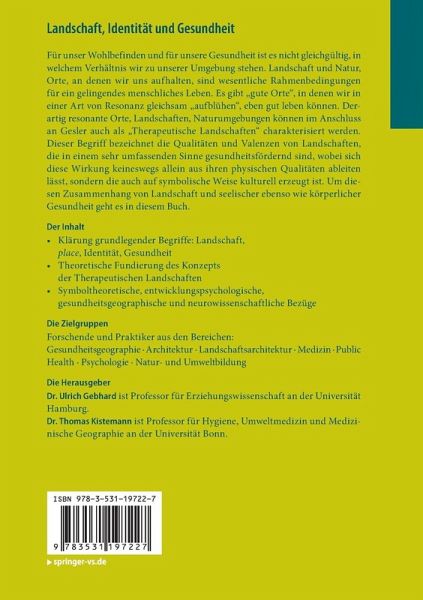 Für unser Wohlbefinden und für unsere Gesundheit ist es nicht gleichgültig, in welchem Verhältnis wir zu unserer Umgebung stehen. Landschaft und Natur, Orte, an denen wir uns aufhalten, sind wesentliche Rahmenbedingungen für ein gelingendes menschliches Leben. Es gibt "gute Orte", in denen wir in einer Art von Resonanz gleichsam "aufblühen", eben gut leben können. Derartig resonante Orte, Landschaften, Naturumgebungen können im Anschluss an Gesler auch als "Therapeutische Landschaften" charakterisiert werden. Dieser Begriff bezeichnet die Qualitäten und Valenzen von Landschaften, die in einem sehr umfassenden Sinne gesundheitsfördernd sind, wobei sich diese Wirkung keineswegs allein aus ihren physischen Qualitäten ableiten lässt, sondern die auch auf symbolische Weise kulturell erzeugt ist. Um diesen Zusammenhang von Landschaft und seelischer ebenso wie körperlicher Gesundheit geht es in diesem Buch.