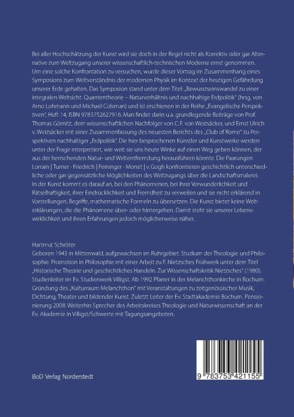 Bei aller Hochschätzung der Kunst wird sie doch in der Regel nicht als Korrektiv oder gar Alternative zum Weltzugang unserer wissenschaftlich-technischen Moderne ernst genommen. Um eine solche Konfrontation zu versuchen, wurde dieser Vortrag im Zusammenhang eines Symposions zum Weltverständnis der modernen Physik im Kontext der heutigen Gefährdung unserer Erde gehalten. Das Symposion stand unter dem Titel: Bewusstseinswandel zu einer integralen Weltsicht. Quantentheorie - Naturverhältnis und nachhaltige Erdpolitik (hrsg. von Arno Lohmann und Michael Colsman) und ist erschienen in der Reihe Evangelische Perspektiven, Heft 14, ISBN 9783752627916. Man findet darin u.a. grundlegende Beiträge von Prof. Thomas Görnitz, dem wissenschaftlichen Nachfolger von C.F. von Weizsäcker, und Ernst Ulrich v. Weizsäcker mit einer Zusammenfassung des neuesten Berichts des Club of Rome zu Perspektiven nachhaltiger Erdpolitik. Die hier besprochenen Künstler und Kunstwerke werden unter der Frage interpretiert, wie weit sie uns heute Winke auf einen Weg geben können, der aus der herrschenden Natur- und Weltentfremdung herausführen könnte. Die Paarungen Lorrain Turner · Friedrich Feininger · Monet v. Gogh konfrontieren geschichtlich unterschiedliche oder gar gegensätzliche Möglichkeiten des Weltzugangs über die Landschaftsmalerei. In der Kunst kommt es darauf an, bei den Phänomenen, bei ihrer Verwunderlichkeit und Rätselhaftigkeit, ihrer Eindrücklichkeit und Fremdheit zu verweilen und sie nicht erklärend in Vorstellungen, Begriffe, mathematische Formeln zu übersetzen. Die Kunst bietet keine Welterklärungen, die die Phänomene über- oder hintergehen. Damit steht sie unserer Lebenswirklichkeit und ihren Erfahrungen jedoch möglicherweise näher.